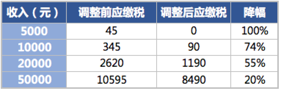 个税到底降了多少,我们通过一张表来看看不同群体在个税调整前后的缴税变化: